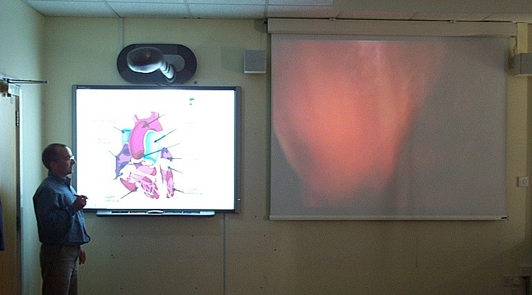 Although interactive whiteboards have been used extensively in schools and further education intuitions, their use in higher education has been limited. One reason why the boards may be less popular within higher education is due to the problems associated with large group teaching. To be used interactively within a large lecture theatre the board must be low enough for all parts to be within easy reach. This often means that students at the back of the lecture theatre struggle to see the whole board. The new generation of interactive whiteboards have resolved this problem by linking an interactive whiteboard with an existing data projector. The size of the display image is only limited by the size of the projector screen. The interactive whiteboard can also be used as a dual display which allows the user to select different images on the data projector and interactive whiteboard. For example, a video clip can be displayed on the data project and at an appropriate point the video can be stopped, the image captured, then annotated on the interactive whiteboard (photo).